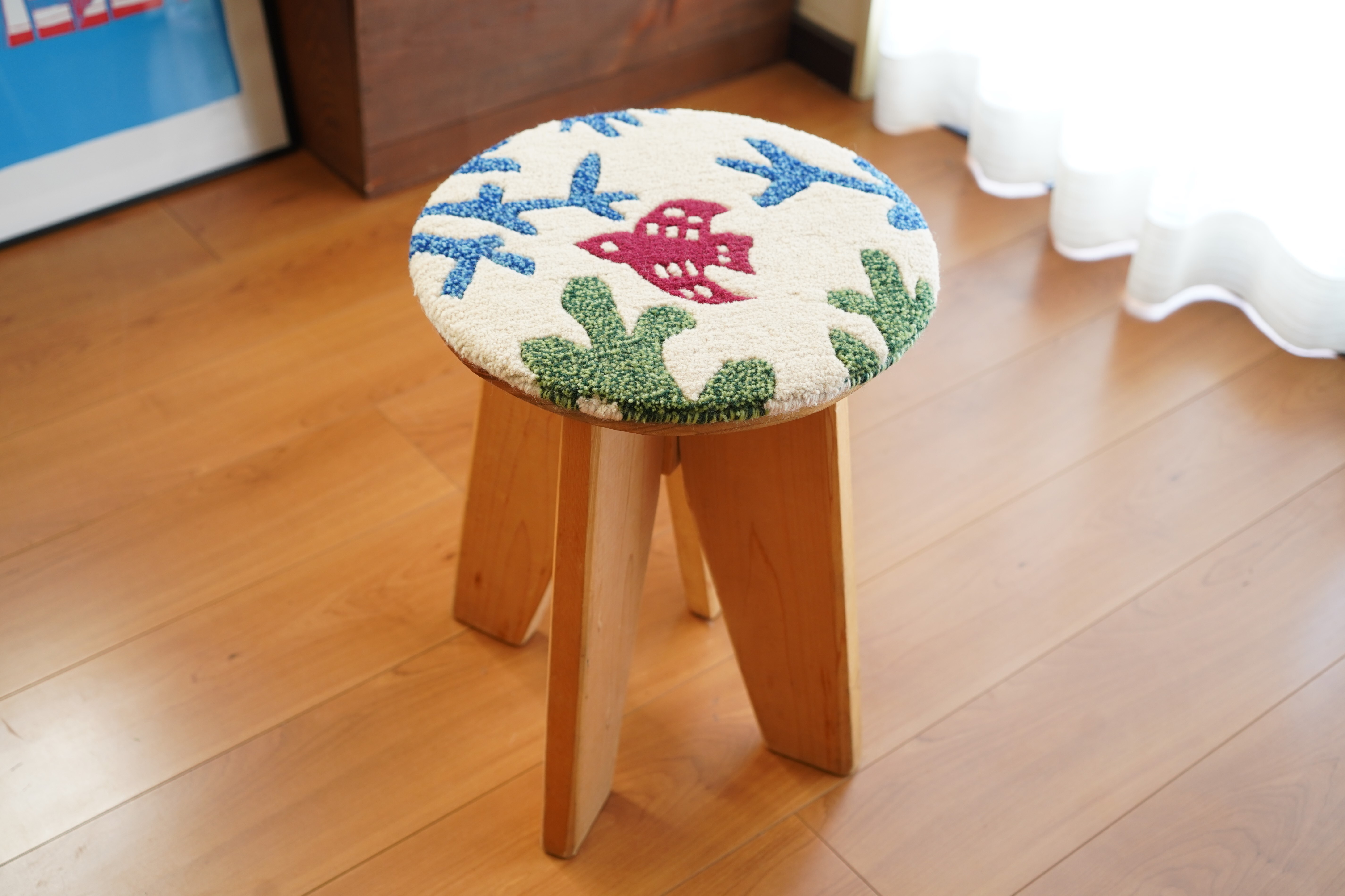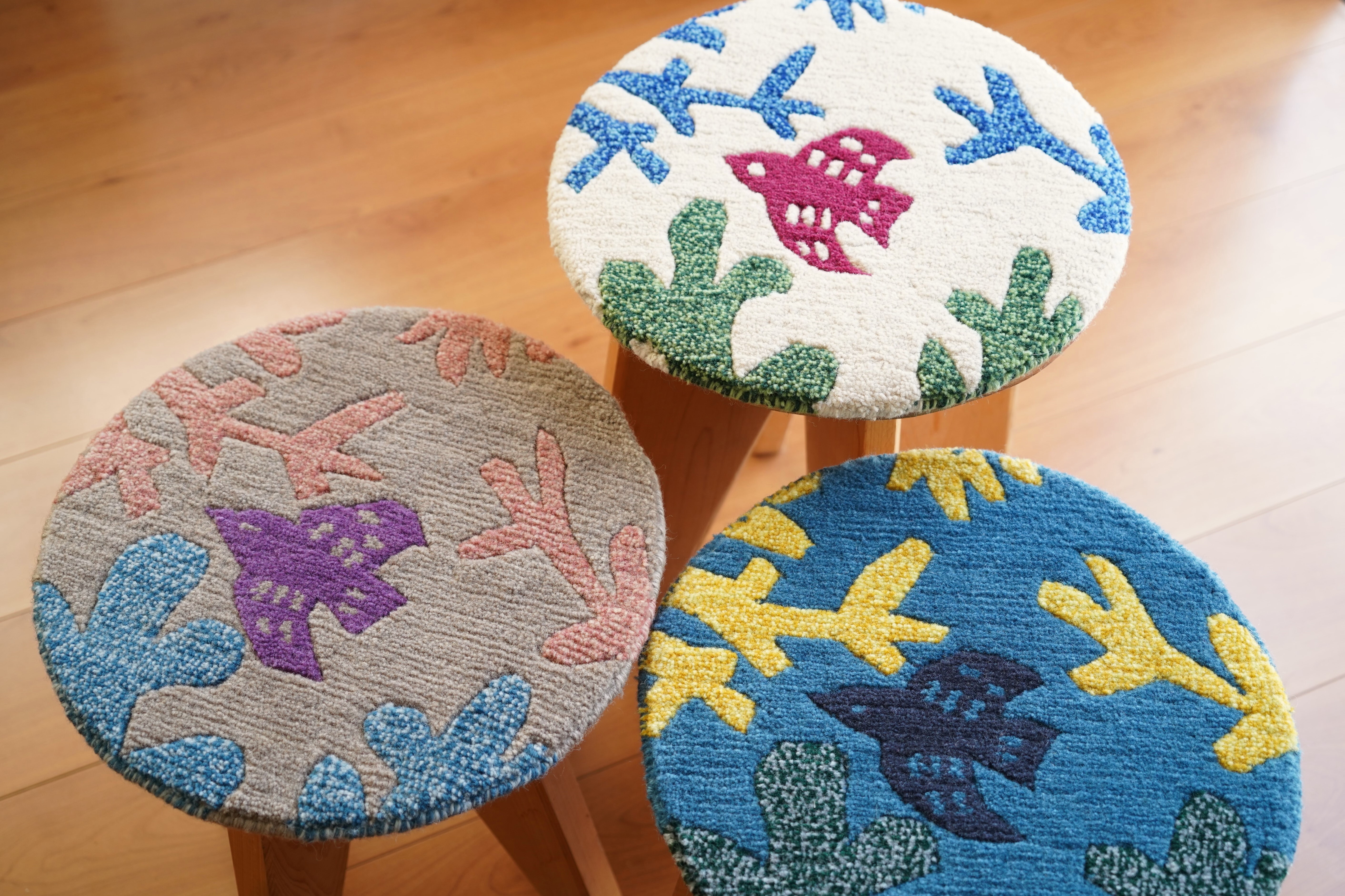 詩や童話の世界のような、一枚の絵から描き出されるラグマット。どこか懐かしさを感じさせる色合いと、手仕事から生まれるぬくもりとやわらかな彩り。