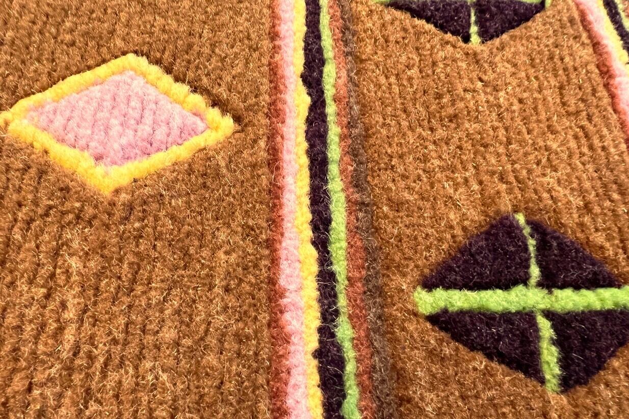 羊毛を紡ぎ糸にして美しく染め上げ、チベット結びという伝統的な技法で1ノット1ノット丁寧に手織りしています。